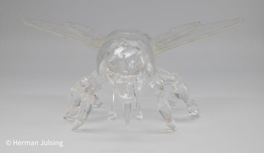 De voeten van zowel de glazen als de houder van de karaf zijn vormgesmolten, geslepen, gepolijst op maat. De onderkant van de voetjes hebben hun matte blanke kleur behouden en de boven en buitenkant zijn geslepen tot grid 3000. Daardoor is van buitenaf de onderkant zichtbaar en geeft diepte in het glas.