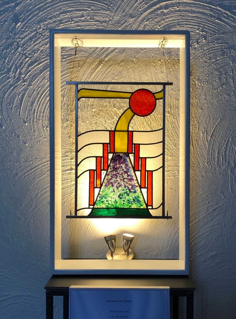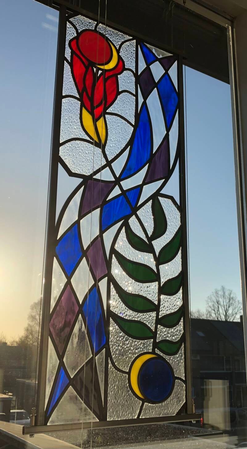 In dit werk combineer ik geblazen glas, gefused (gesmolten) glas en glas in lood.